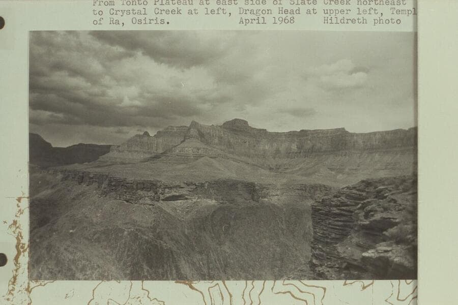 From Tonto Plateau at east side of Slate Creek northeast to Crystal Creek at left, Dragon Head at upper left, Temple of Ra, Osiris