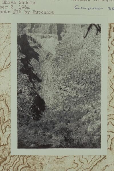 Down the arm of Dragon Creek which reaches east toward Shiva Saddle. From below the top of Supai Formation. Route down is the northern of 2 notches in Supai rim at the south end of Shiva Saddle