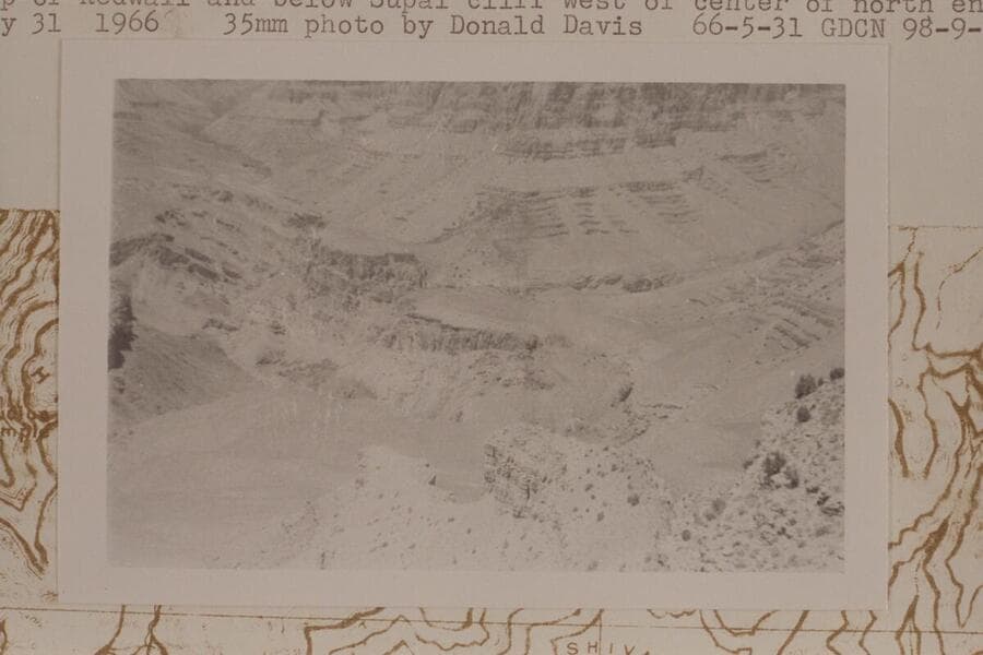 Crystal-Dragon junction from point where Stanton made his photo 354-486 in 1890, Feb. Top of Redwall and below Supai cliff west of center of north end of Ra