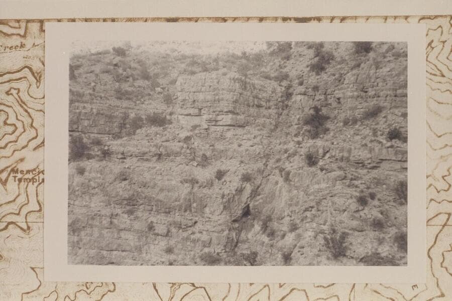 Entrance to Olla Vieja Cave below and left of center looking across the draw from point above Redwall climb