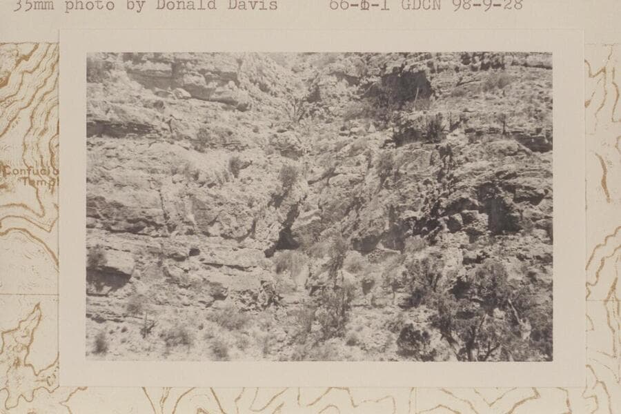 Entrance to Olla Vieja Cave below and left of center looking across the draw from point above Redwall climb