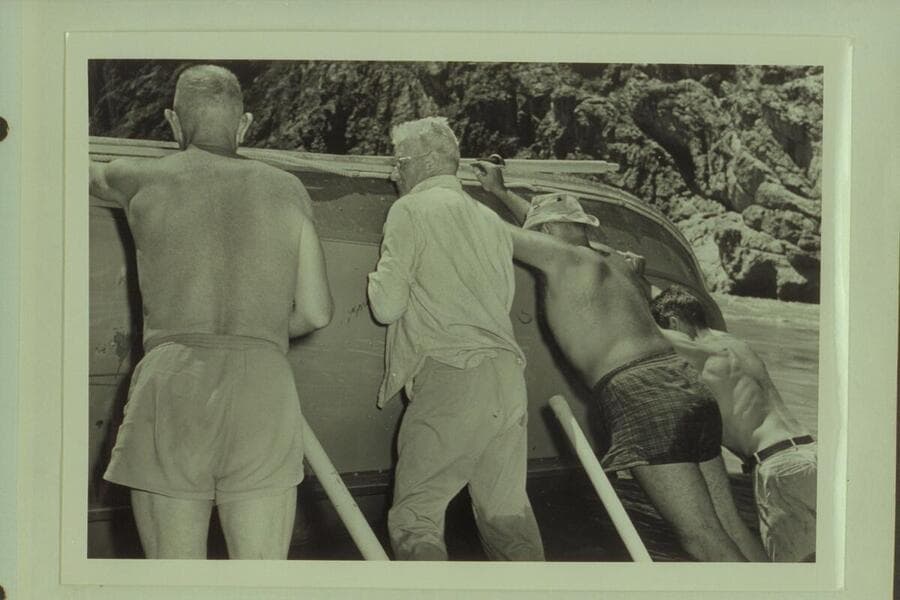 Repairing the CACTUS at the foot of Tuna Creek Rapid. Belknap and Taylor fashioning a patch