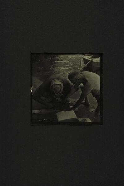 Repairing the CACTUS at the foot of Tuna Creek Rapid. Belknap and Taylor fashioning a patch