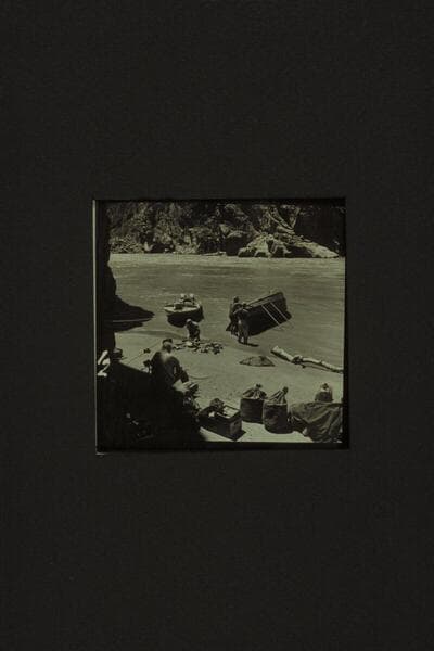 Repairing the CACTUS at the foot of Tuna Creek Rapid. Taylor, Desloge, Belknap and Cutler lifting the boat higher as it sinks into the quicksand