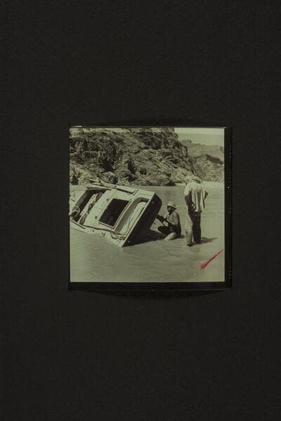 Bill Belknap drills holes for the patching of the "CACTUS" at Tuna Creek Rapid, just above Esmeralda Bend, Grand Canyon