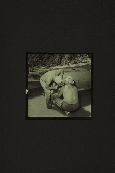 Repairing the CACTUS at the foot of Tuna Creek Rapid. Belknap and Taylor fashioning a patch
