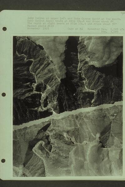 Ruby Canyon Rapid at extreme left. The rapid at center is Mile 105. The left margin of the print is Mile 104.35