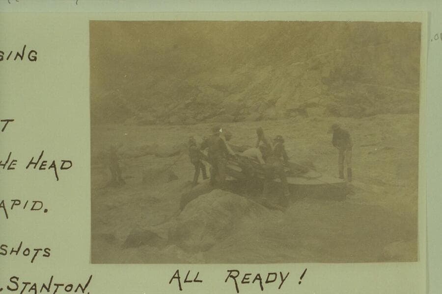 Portage by Stanton crew: "Lifting a Boat over the Head of a Rapid. Grand Canon."