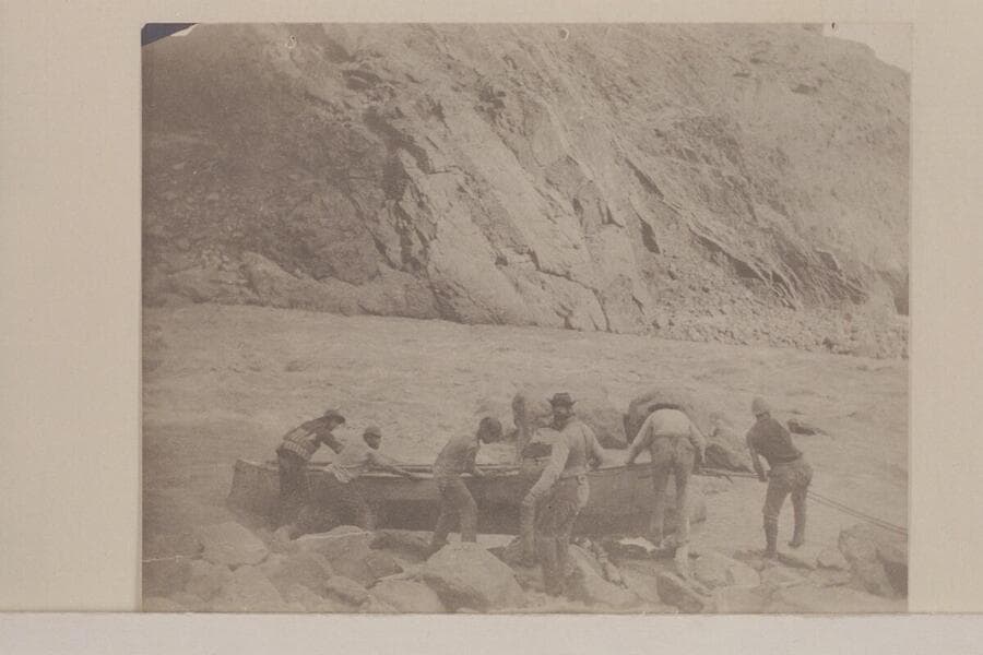 Portage by Stanton crew: "Lifting a Boat over the Head of a Rapid. Grand Canon."