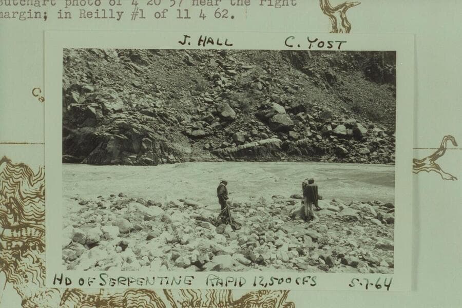 Head of Serpentine Rapid. J. Hall and C. Yost on the fan. Preliminary gauge: 12,500 cfs. The pegmatite at center appears in Butchart photo of 1957, Apr. 20 near the right margin; in Reilly #1 of 1962, Nov. 04