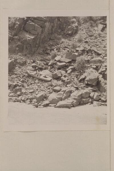 Russell-Tadje boat on left bank above Bass Cable. Grand Canyon, Mile 108. "Ole Claude" Nichols stands in the background