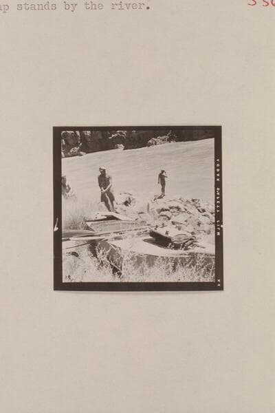 Rod Sanderson and Claude Nichols at Russell-Tadje boat, the "Ross Wheeler," left on the left bank above Bass Cable in 1915. Belknap stands by the river