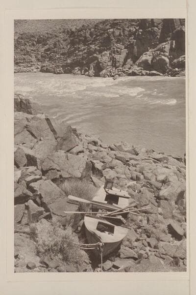 Rod Sanderson and Claude Nichols at Russell-Tadje boat, the "Ross Wheeler," left on the left bank above Bass Cable in 1915. Belknap stands by the river