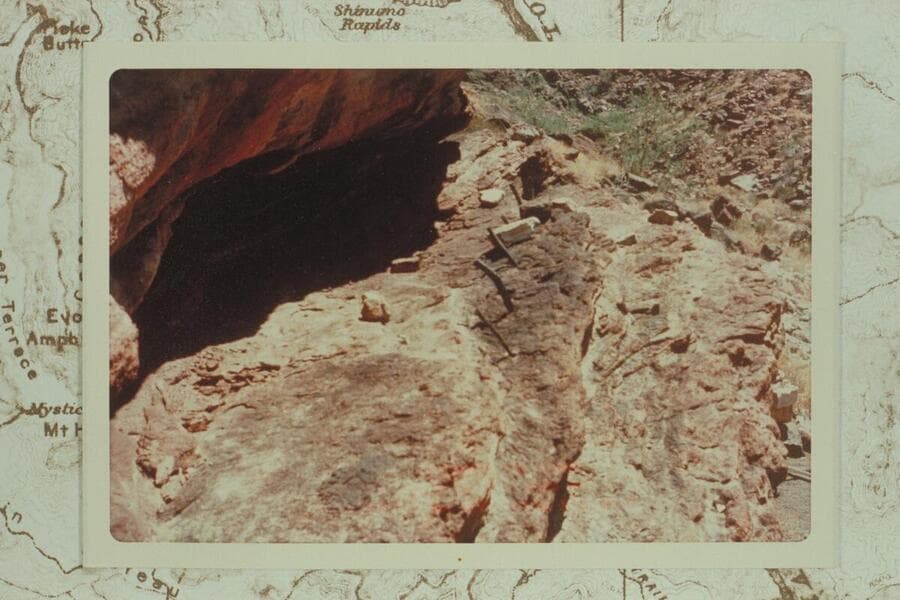 The upper story of the "Houserock" at the Bass Mine in Hakatai Canyon. Note the poles inserted into holes in the ledge. This ledge is about half way up the rock