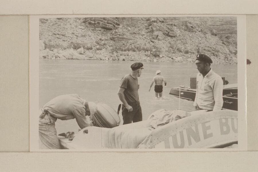 Camp on right bank near Mile 115; Tapeats formation. Left to right: Jordan, Sanderson, Taylor and MacDonald