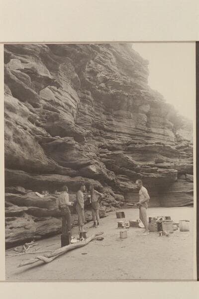 Camp on right bank near Mile 115; Tapeats formation. Left to right: Jordan, Sanderson, Taylor and MacDonald