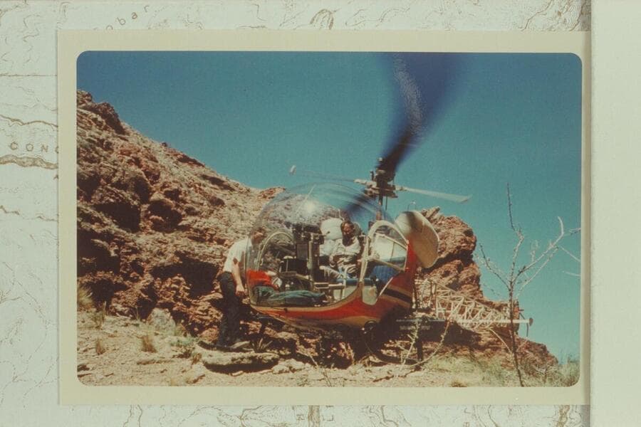 Helicopter leaving Royal Arch Creek carrying the injured Harvey Butchart. North of Royal Arch Creek