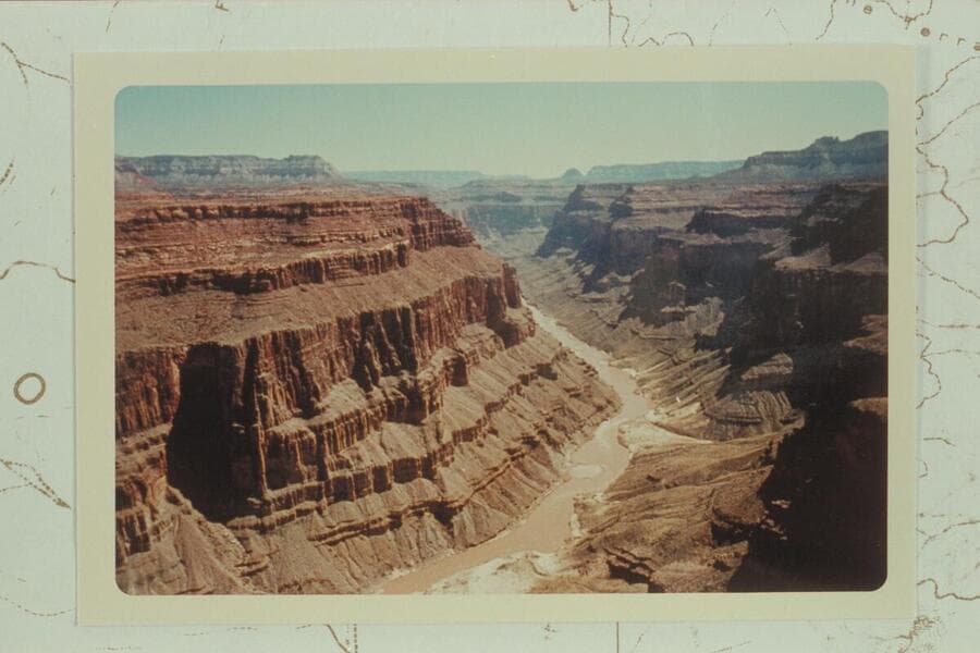 Hildreth posed on Esplanade below Enfilade Point. Mouth of Forster Canyon at lower left