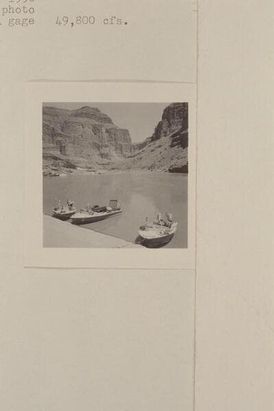 Fleet moored at left bank at Mile 123. Repairs are being made to the two engines of the "Bootoo." Preliminary Bright Angel gauge: 49,800 cfs