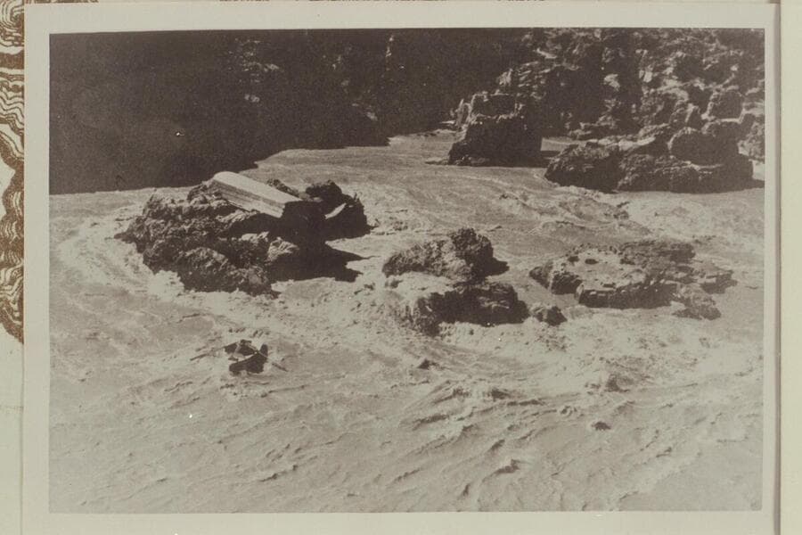 Bureau of Reclamation aluminum barge on the bedrock in Bedrock Rapid where it hung after getting loose at Lees Ferry. The scow moved to Mile 193, left bank, in 1948