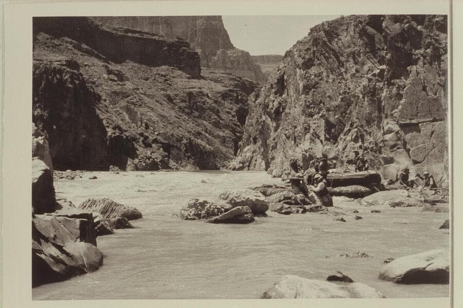 Georgie White's pontoon rig in Dark Canyon Rapid. The print is reversed