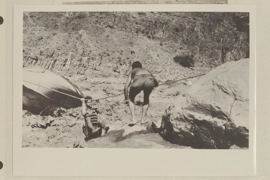 Bill Adger comes ashore from efforts to salvage the "Powell" locked in the rocks of Dubendorff Rapid