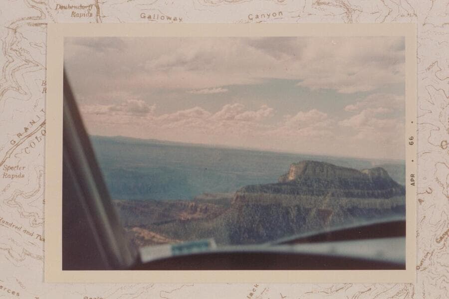 A view of the Steamboat Mountain and Sanddle Canyon areas of the Grand Canyon taken from the Muav Saddle. There is a light-colored donkey or mule in the foreground. "3041" written in white in the lower left corner.