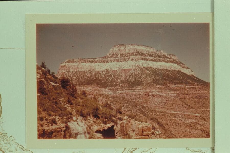 A view of the Steamboat Mountain and Sanddle Canyon areas of the Grand Canyon taken from the Muav Saddle. There is a light-colored donkey or mule in the foreground. "3041" written in white in the lower left corner.