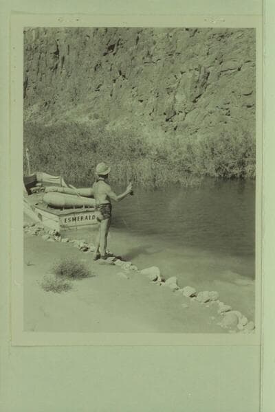 Marston fishing by the "Esmeralda" in lagoon at Tapeats Creek