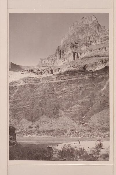 Fishing at camp at the mouth of Tapeats Creek. Left to right: Desloge, Forcier and Marston. The motorboat in the lagoon