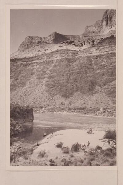 Fishing at camp at the mouth of Tapeats Creek. Left to right: Desloge, Forcier and Marston. The motorboat in the lagoon