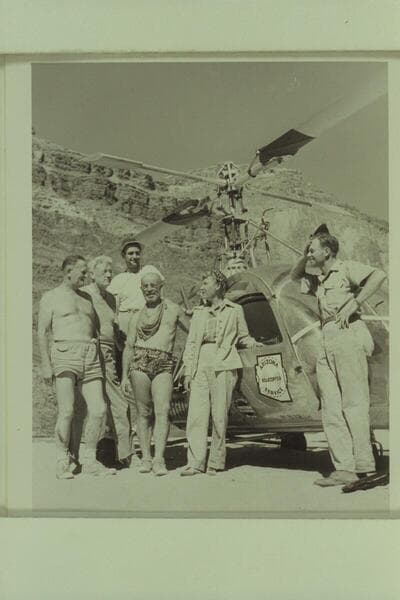 Helicopter and crew on beach at Tapeats Creek. Left to right: Taylor, Desloge, Marston, Forcier, Margaret Marston and "Red" Carson