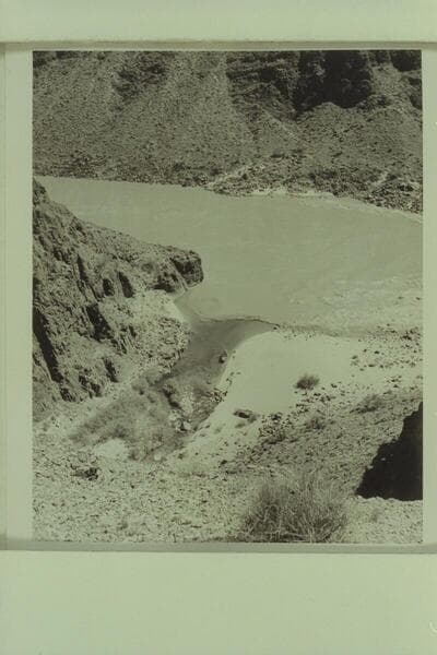 Fishing at camp at the mouth of Tapeats Creek. Left to right: Desloge, Forcier and Marston. The motorboat in the lagoon