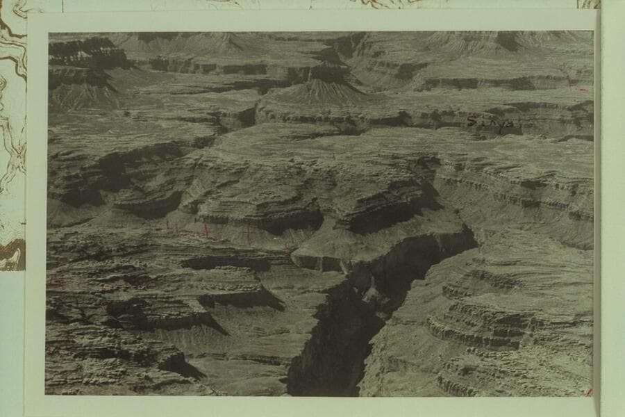 Down Grand Canyon from near Mt. Sinyala. Yumtheska Point at upper left. Snow on Mt. Emma in distance