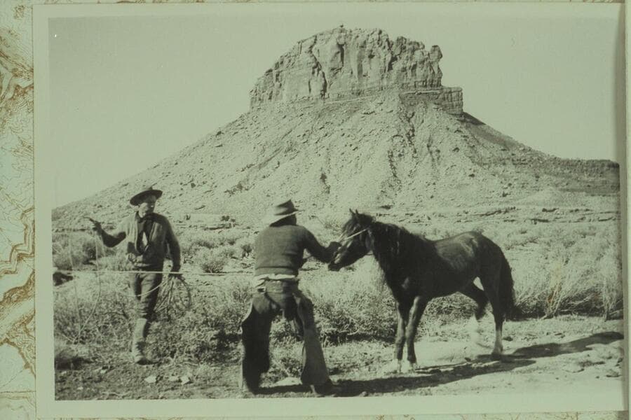 Wild Horse on a rope. The butte behind the horse is Mt. Akaba. The horse and man are south of Akaba looking north. Photo 500 of Expedition to So-Called "Canyon of the Little Horses."