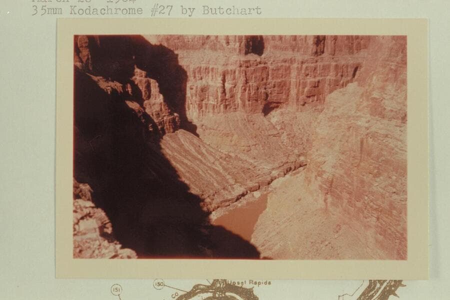 In the Redwall in side canyon at Mile 148.5. The drop-offs are below this