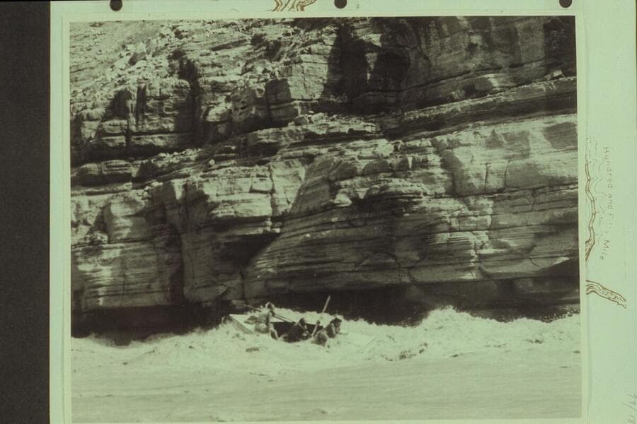 Pres Walker at the oars of the "Mexican Hat II", Ed Olsen stands forward, Marston on the after deck; Grand Canyon traverse