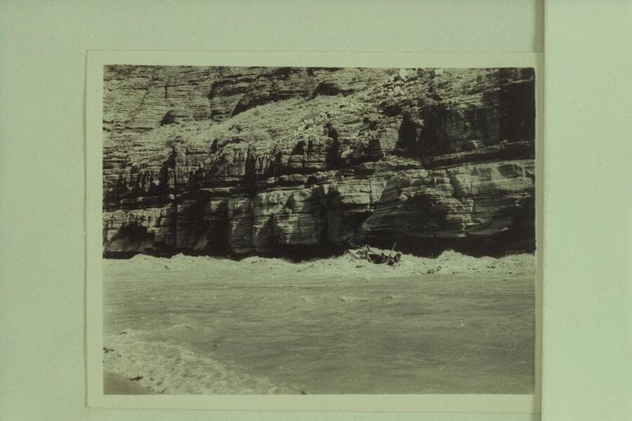 Pres Walker at the oars of the "Mexican Hat II", Ed Olsen stands forward, Marston on the after deck; Grand Canyon traverse