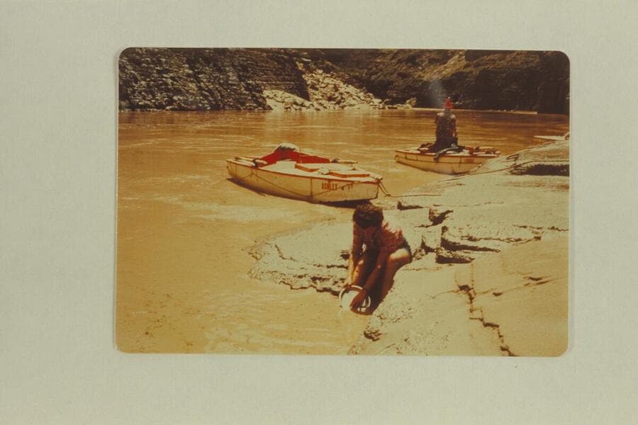 Washing dishes at lunch camp; Mile 151.6, right bank. Reilly-Reynolds party; Susie Reilly in foreground