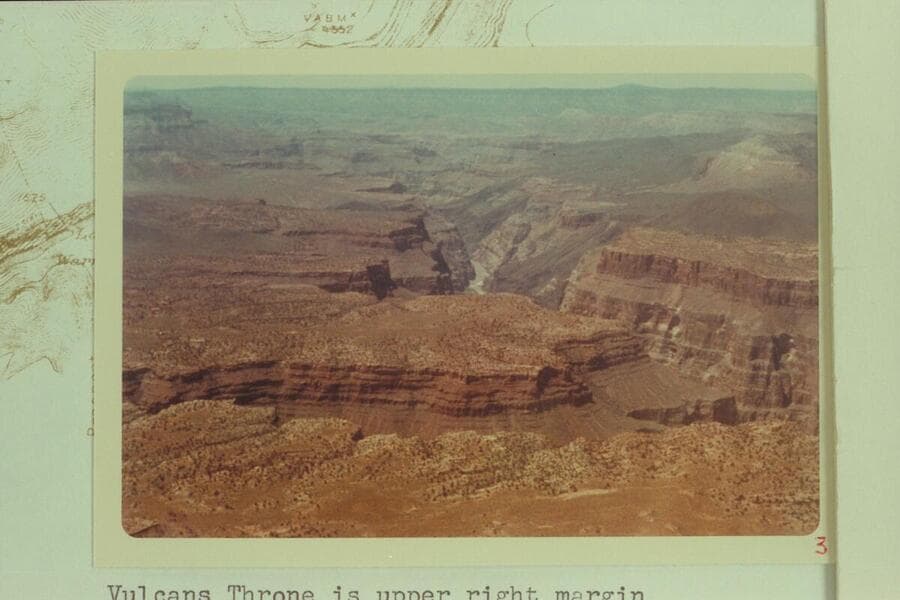 Down Grand Canyon from Mile 176 1/2. Vulcans Throne is upper right margin. The Uinkaret Mountains form the skyline with Mt. Trumbull at upper right margin