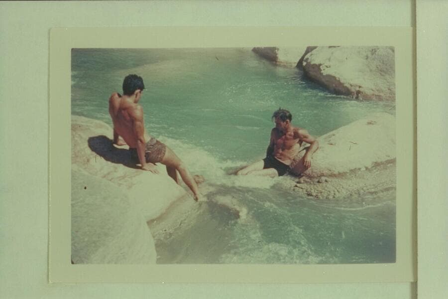 Bruce Wilson and Garth Marston swimming at the foot of the Tanner Trail