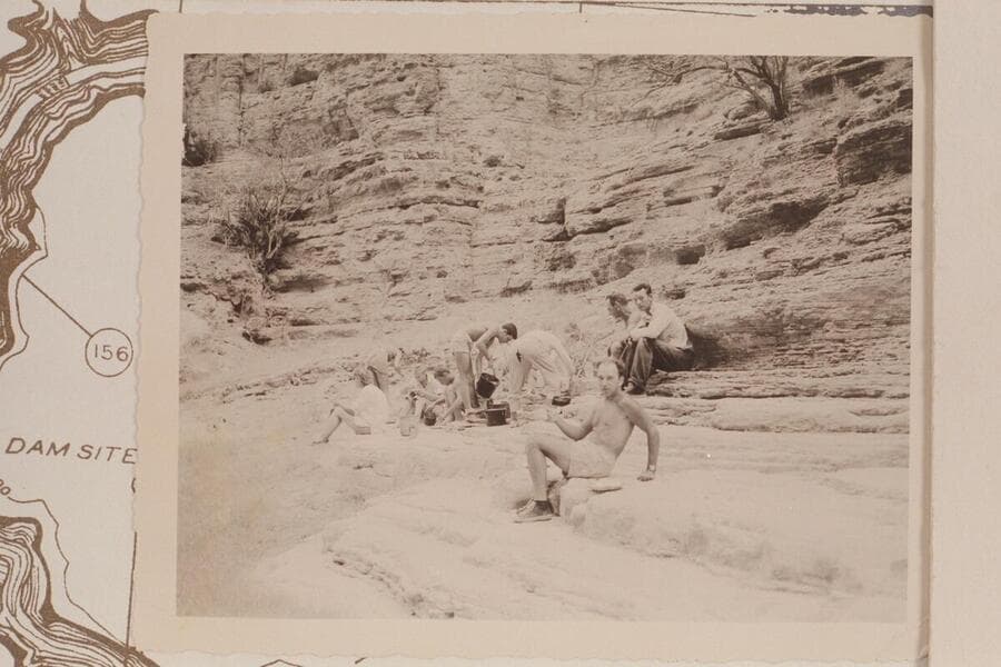 Nevills party camped at the head of the lagoon at the mouth of Supai Creek. Nevills and Kent Frost at right, Al Milotte front center