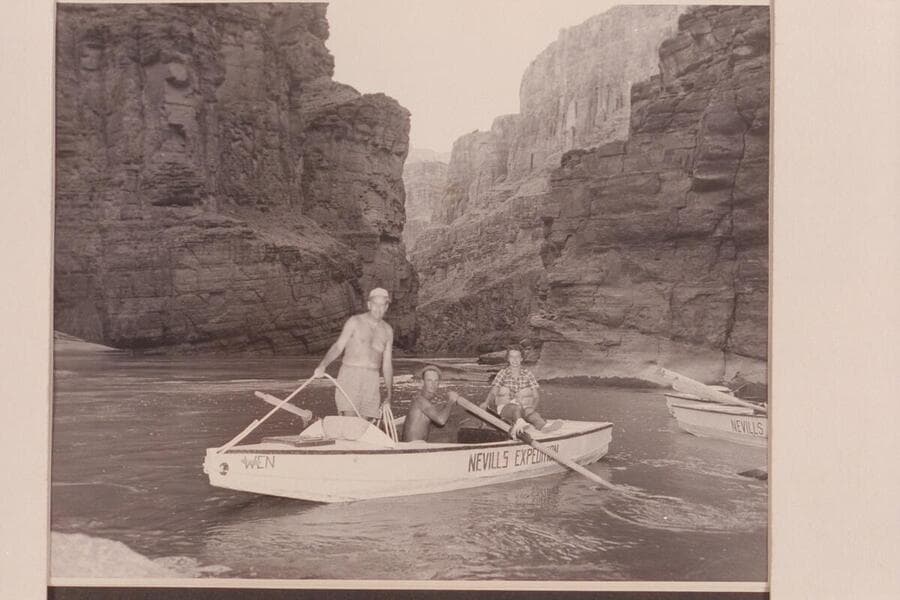 John Doerr, Norm Nevills and Nancy Streator in the "WEN" at mouth of Supai Creek, Grand Canyon