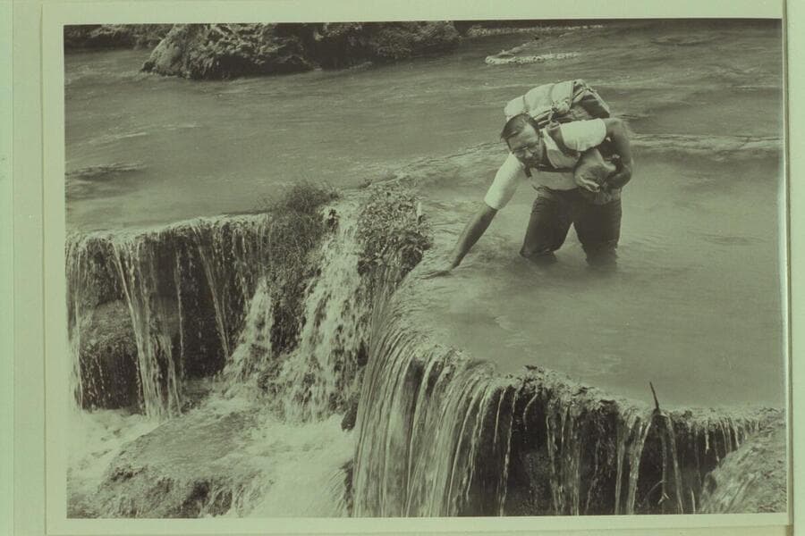 Jorgen Visbak crossing Supai Creek on one of the travertine dams between the village of Supai and Beaver Falls