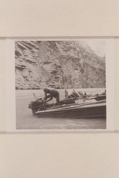 Rod works at a motor on the "Rattlesnake"; camp at Mile 157 in Grand Canyon