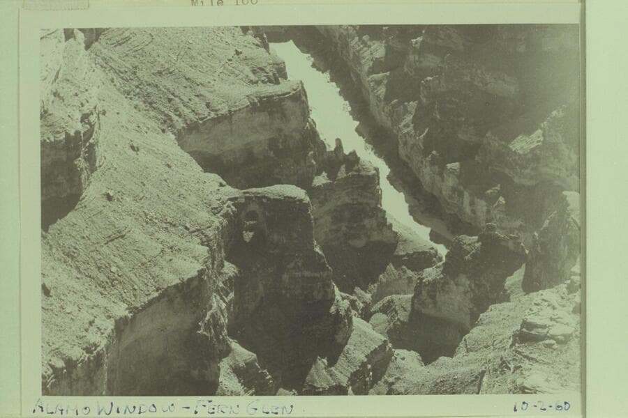 Down Fern Glen Canyon to its mouth showing Alamo Window at left