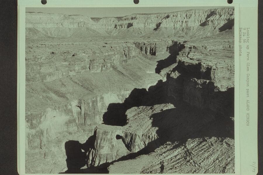 Down Fern Glen Canyon to its mouth showing Alamo Window at left