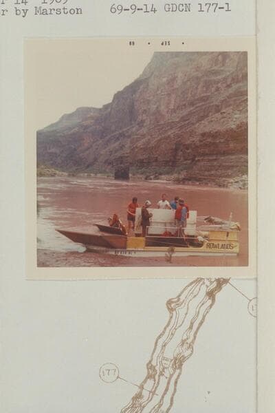 Deck boat ready for departure from camp at Mile 177.6 left bank. The Lava Pinnacle, Vulcans Anvil is [sic] middle distance
