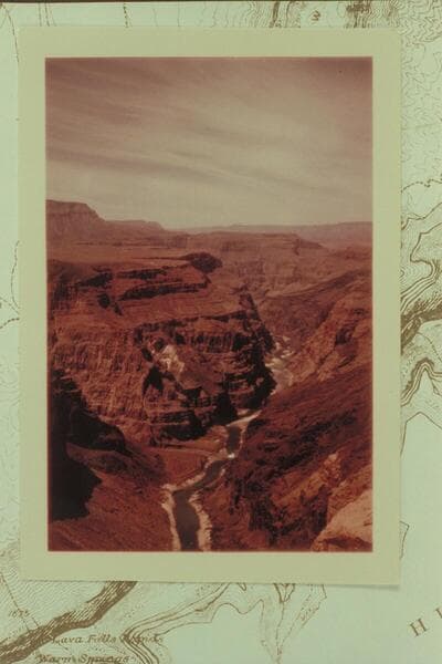 From the overlook down Grand Canyon to Vulcan Rapid showing the cinder cone at the rim of the left bank