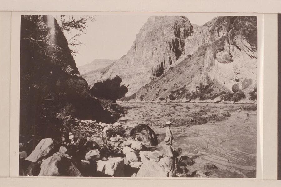Looking downstream from head of Lava Falls. Koms with straw hat. Moore with white cap. Photo from Lint album